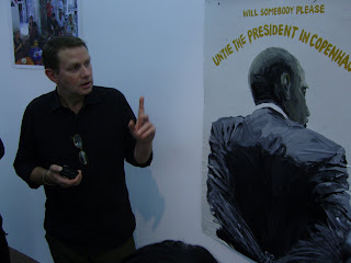 Peter Ravn explaining his work "Will someone please UNTIE THE PRESIDENT IN COPENHAGEN" pointing at the fact that Barak Obama has little leverage to meet climate demands.