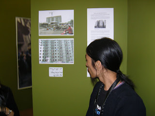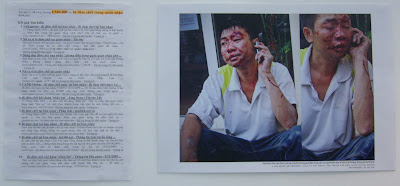 Translator Ngo Huong Ly in front of Peter Lind's work "Made In Sweatshop", addressing poor working conditions in the industries of 3 world countries